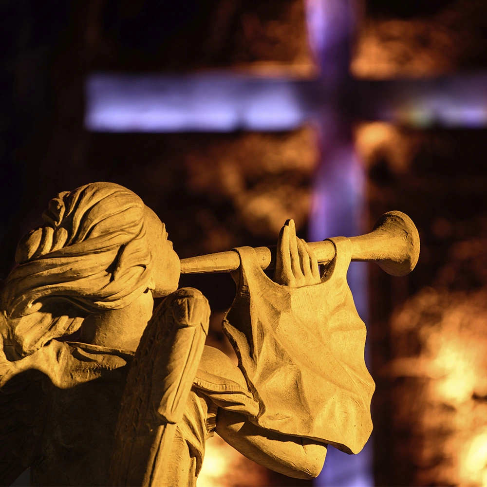 Desde lo alto, se vislumbra la figura de San Gabriel Arcángel, esculpida en piedra arenisca por José Vicente Pinto, como guardián de los visitantes de la Catedral. Esta obra forma parte de las múltiples expresiones artísticas que enriquecen este lugar, único en el planeta.